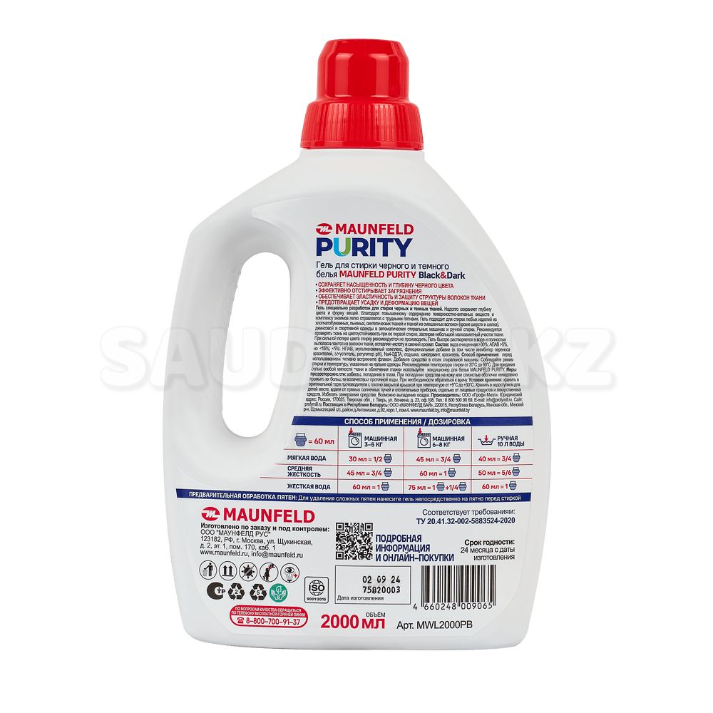 Гель Maunfeld Purity Black & Dark MWL2000PB — специализированное жидкое средство для стирки чёрных и тёмных тканей. Обеспечивает бережное удаление загрязнений, защищает цвет и предотвращает выцветание. Подходит для ручной и машинной стирки, обладает экосредством без фосфатов и биоразлагаемым составом. Один флакон объёмом 2 л рассчитан на примерно 66 циклов стирки.