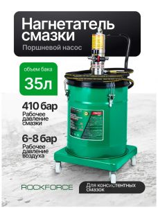 RockFORCE предназначен для нагнетания смазочного материала под высоким давлением. Перекатной нагнетатель способен вместить до 35 кг смазочного материала. Это означает, что он может работать непрерывно в течение продолжительного времени без необходимости частой замены смазки.