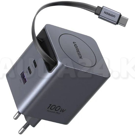 Сетевое зарядное устройство с выдвижным кабелем UGREEN X616 (65828) 100W GaN Fast Charger 2*USB-Camp;USB-A with Retractable Cable USB-C. Цвет: серый космос
